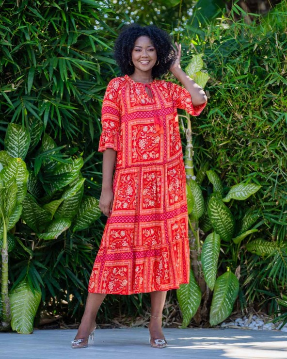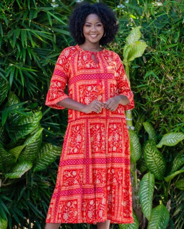 Longue robe fluide à motifs orientaux. Manches longues à volants au niveau des poignets. Col rond froncé réglable grâce à un lien orné de pompons.