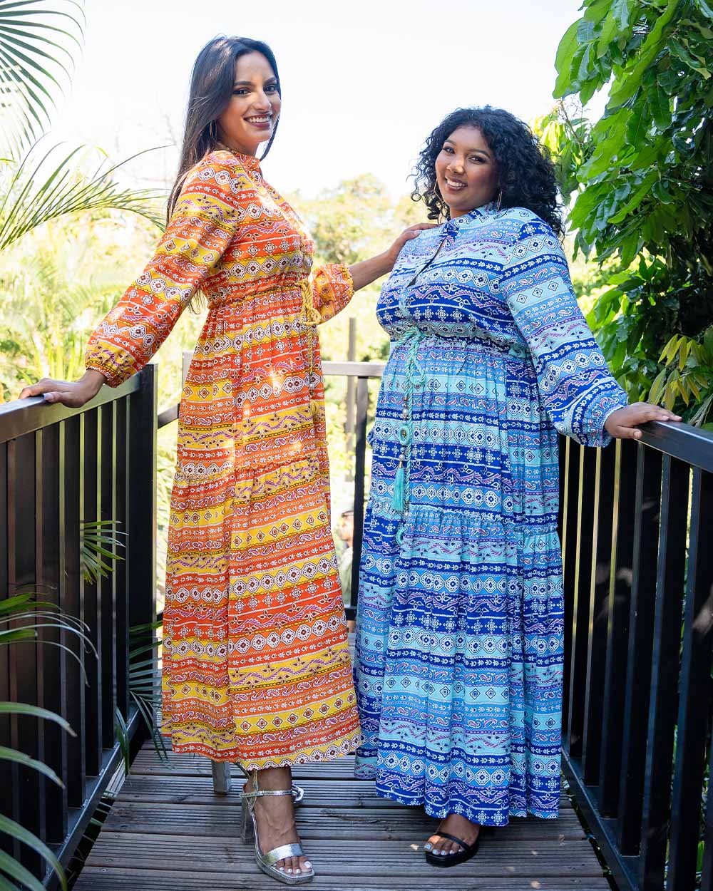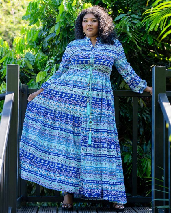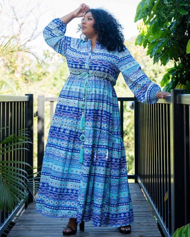 Longue robe fluide à motifs ethniques, ceinturée à la taille par un cordon orné de pompons, perles et grelots. Manches longues resserrées au niveau du poignet. Col mao à boutons.