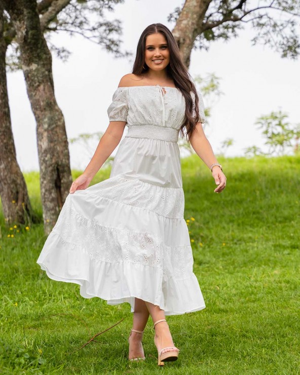Longue robe à volant avec broderie, manches aux épaules dénudées