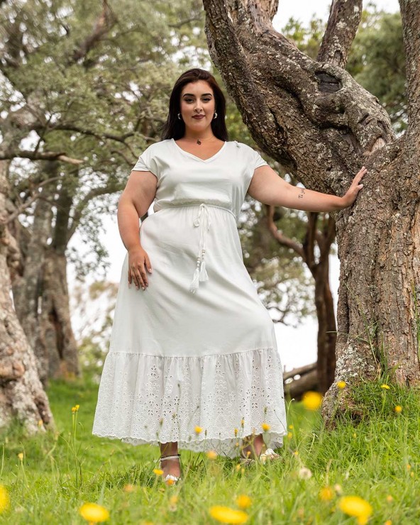 Longue robe unie avec volant en broderie anglaise en bas de la jupe. Taille ajustée grâce à un élastique